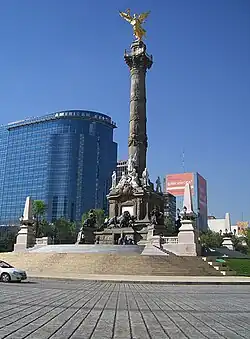 It was only when the population reached about six million that Mexico City started to need to appropriate water from outside the valley.[3] Today, Mexico City faces a serious water deficit. Because of increased demand from a growing population, increasing industry, and ecosystem degradation in the form of deforestation of the surrounding mountains, more water is leaving the system than is entering. It is estimated that 63 cubic meters per second (1,000,000 US gal/min) of water is needed to support the potable and agricultural irrigation needs of Mexico City's population.[3] The main aquifer is being pumped at a rate of 55.5 m3/s (880,000 US gal/min), but is only being replaced at 28 m3/s (440,000 US gal/min), or about half of the extraction rate, leaving a shortfall of 27.5 m3/s (436,000 US gal/min).[3] This over-extraction of groundwater from the old clay lake bed has been causing the land upon which the city rests to collapse and sink. This problem began in the early 20th century as a consequence of the drainage of the valley for flood control. Since the beginning of the 20th century, some areas of Mexico City have sunk nine meters (30 feet).[3] In 1900, the bottom of the lake was three meters (9.8 feet) lower than the median level of the city center. By 1974, the lake bottom was two meters (6.6 feet) higher than the city.[8] The first signs of dropping ground water levels was the drying up of natural springs in the 1930s, which coincides with the beginning of intensive exploitation of the aquifer system through wells between 100 and 200 meters (330 and 660 ft) deep.[8] Today, Mexico City is sinking between five and forty centimeters (0.2 and 1.3 ft) per year, and its effects are visible.[3] El Ángel de la Independencia ("The Angel of Independence") statue, located on Paseo de la Reforma was built in 1910, anchored by a foundation deep beneath what was the surface of the street at that time. However, because the street has sunk around it, steps have been added to allow access to the statue's base.[3]