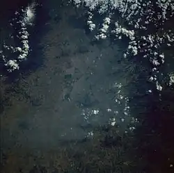The Valley of Mexico is located in the Trans-Mexican Volcanic Belt.[5][3] The valley contains most of the Mexico City metropolitan area, as well as parts of the State of Mexico, Hidalgo, Tlaxcala, and Puebla. The Basin of Mexico covers approximately 9,600 km2 (3,700 sq mi) in the NNE-SSW direction with length to width dimensions of approximately 125 km (78 miles) to 75 km (47 miles)[6] The Valley of Mexico can be subdivided into four basins, but the largest and most-studied is the area that contains Mexico City. This section of the valley in particular is colloquially referred to as the "Valley of Mexico".[7] The valley has a minimum elevation of 2,200 meters (7,200 ft) above sea level and is surrounded by mountains and volcanoes that reach elevations of over 5,000 meters (16,000 ft).[8] It is an enclosed valley with no natural outlet for water to flow to the sea although there is a gap to the north where there is a high mesa but no high mountain peaks. Within this vulnerable watershed all the native fishes were extinct by the end of the 20th century.[9] Hydrologically, the valley has three features. The first feature is the lakebeds of five now-extinct lakes, which are located in the southernmost and largest of the four sub-basins. The other two features are piedmont, and the mountainsides that collect the precipitation that eventually flows to the lake area. These last two are found in all four of the sub-basins of the valley.[5][7] Today, the Valley drains through a series of artificial canals to the Tula River, and eventually the Páruco River and the Gulf of Mexico. Seismic activity is frequent here, and the valley is an earthquake-prone zone.[10]