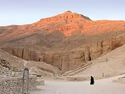 The Theban Hills are dominated by the peak of al-Qurn, known to the Ancient Egyptians as ta dehent, or "The Peak".[22] It has a pyramid-shaped appearance, and it is probable that this echoed the pyramids of the Old Kingdom, more than a thousand years prior to the first royal burials carved here.[23][24] Its isolated position also resulted in reduced access, and special tomb police (the Medjay) were able to guard the necropolis.[25]