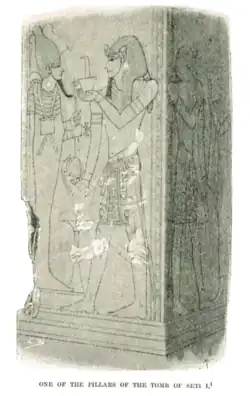 His son and successor, Seti I's tomb KV17 (also known as Belzoni's tomb, the tomb of Apis, or the tomb of Psammis, son of Necho), is usually regarded as the finest tomb in the valley. It has extensive relief work and paintings. When it was rediscovered by Belzoni in 1817, he referred to it as "a fortunate day."[83]