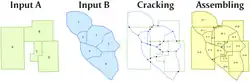 - Assembling part A: Find each minimal closed ring of lines, and use it to create a polygon. Each of these will be a least common geographic unit (LCGU), with at most one "parent" polygon from each of the two inputs.