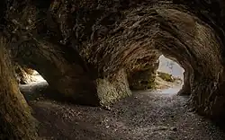 The cave is located on a hill 20 m (66 ft) above the river Lone with a 180 degree view over the valley.[2] The Y-shaped cave occupies about 170 m2 (1,800 sq ft) and had an initial height of three to four meters. There are three entrance holes. Two large, 2.5 to 3.5 meter high entrance holes are connected by an approximately 40 m (130 ft) long curved gallery – called the "Big Cave". The second gallery, the "Small Cave", is of the same length but very narrow, the entrance being too small to be used. A passage between the two caves is except for a tiny gap at the top completely filled with debris and sediment deposits.