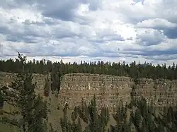 The Chilcotin Group, a 50,000 km2 (19,000 sq mi) large igneous province and volcanic plateau in south-central British Columbia, consists of thin, flat-lying, poorly formed columnar basalt lava flows that have formed as a result of partial melting in a weak zone in the upper part of the Earth's mantle within a back-arc basin related to subduction of the Juan de Fuca Plate.[3] Chilcotin Group volcanism occurred in three distant magmatic episodes, the first 16-14 million years ago, the seconed 10-6 million years ago and the third 3-1 million years ago.[3] Anahim Peak, a volcanic plug near the eastern flank of the Rainbow Range, and other plugs penetrating the Chilcotin Group are suggested to be vents for basalt volcanism.[3] These volcanic plugs form a northwest trend about 150 kilometres (93 mi) inland from the Pemberton and Garibaldi volcanic belts and exist along the axis of the volcanic plateau.[3] Silicic tuff lying between Chilcotin basalt lava flows, likely originated from explosive eruptions related to arc volcanism in the Garibaldi and Pemberton belts just to the west and was preserved between successive basaltic lava eruptions in the Chilcotin back-arc basin.[3] It is suggested by geoscientists the Chilcotin Group forms a sequence of merged low-profile shield volcanoes erupted from central vents.[3]