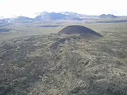 The Yukon portion of the northwest trending Northern Cordilleran Volcanic Province includes the youngest volcanoes in Northern Canada. The Fort Selkirk Volcanic Field in central Yukon consists of valley-filling basalt lava flows and cinder cones.[20] Ne Ch'e Ddhawa, a cinder cone 2 kilometres (1.2 mi) away from the connection of the Yukon and Pelly rivers formed between 0.8 and one million years ago when this area lied beneath the vast Cordilleran Ice Sheet.[76] The youngest volcano, Volcano Mountain just north of the junction of the Yukon and Pelly rivers, formed in past 10,000 years (Holocene), producing lava flows that remain unvegetated and appear to be only a few hundred years old. However, dating of sediments in a lake impounded by the lava flows indicated that the youngest lava flows could not be younger than mid-Holocene and could be early Holocene or older. Therefore, the most recent activity in the Fort Selkirk volcanic field is unknown.[20] The lava flows from Volcano Mountain are unusual because they originate much deeper in the Earth's mantle than the more common basaltic lava flows found throughout the Yukon and are very uncommon in the geological record.[77] This lava, known as olivine nephelinite, is also unusual because it contains small, angular to rounded fragments of rock called nodules.[77]