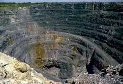 The kimberlite diatremes, or pipes, across Canada have also been important economically, because kimberlite magmas are the world's main source of gem-quality diamonds.[82] Kimberlite pipes form when kimberlite magmas rise considerably from depths as great as 400 kilometres (250 mi).[83] As the kimberlite magmas approach a depth of at least 2 kilometres (1.2 mi), the magma explodes violently through the Earth's crust, carrying fragments of rock that it has collected along the way and, in the right conditions, possibly diamonds, to the surface.[83] The Eocene (ca. 55–50 Ma) age diatremes of the Lac de Gras kimberlite field in the central Slave craton of the Northwest Territories support two world-class diamond mines, called Ekati and Diavik.[84] Ekati, Canada's first diamond mine,[85] has produced 40,000,000 carats (8,000 kg) of diamonds out of six open pits between 1998 and 2008,[85] while Diavik, to the southeast, has produced 35,400,000 carats (7,080 kg) of diamonds since its foundation in 2003.[86] The diamondiferous Drybones Bay kimberlite pipe is the largest diatreme discovered in the Northwest Territories, measuring 900 by 400 metres (3,000 ft × 1,300 ft).[87] Diamondiferous diatremes throughout the Northwest Territories and Alberta have the potential to make Canada one of the world's major producers of gem-quality diamonds.[82]