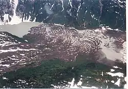 Because volcanic activity in Western and Northern Canada was contemporaneous with the ebb and flow of past glaciations, other volcanoes display ice-contact features. Mount Garibaldi in southwestern British Columbia is the only major volcano in North America known to have formed upon a regional ice sheet during the last glacial period, which began 110,000 years ago and ended between 10,000 and 15,000 years ago.[17] Hoodoo Mountain in northern British Columbia was contained within basins thawed in the ice and assumed the flat-topped, steep-sided form of a tuya.[18] Pyramid Mountain, in the Shuswap Highland of east-central British Columbia, was formed under more than 1,000 metres (3,300 ft) of glacial ice to assume the form of a subglacial mound.[19] The Fort Selkirk Volcanic Field in central Yukon contains volcanic features that were erupted subglacially when the large Cordilleran Ice Sheet existed in this area between 0.8 and one million years ago.[20] |