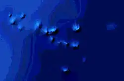 The Explorer Ridge, an underwater mountain range lying 160 kilometres (99 mi) west of Vancouver Island on the Coast of British Columbia, consists of a north-south trending rift zone.[68] It contains one major segment known as the Southern Explorer Ridge, along with other smaller segments, such as the Northern Explorer Ridge.[69] With a depth of 1,800 metres (5,900 ft), the Southern Explorer Ridge is relatively shallow in comparison with most other rift zones of the northeast Pacific Ocean, indicating there has been considerable volcanic activity along this part of the Explorer Ridge in the past 100,000 years.[69] Magic Mountain, a large hydrothermal vent area on the Southern Explorer Ridge, is a scene of this volcanic activity.[69] Unlike most hydrothermal systems found in the Pacific Ocean, the Magic Mountain site is situated outside the primary rift zone.[68] The source for the hydrothermal fluid that fuels Magic Mountain probably rises along fracture systems associated with a recent episode of rifting that, in turn, followed a massive outpouring of lava.[68] In contrast, the Northern Explorer Ridge has evolved into a complex compound structure consisting of several rift basins bounded by half-graben and arcuate shaped faults with a superimposed pattern of rhombohedral grabens and horsts.