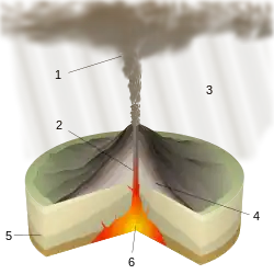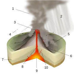 | Pelèan eruptions | ![]() Peléan eruption: 1: ash plume, 2: volcanic ash rain, 3: lava dome, 4: volcanic bomb, 5: pyroclastic flow, 6: layers of lava and ash, 7: strata, 8: magma conduit, 9: magma chamber, 10: dike | Peléan eruptions are violent eruptions characterized by fast-moving streams of hot volcanic gas and rock called pyroclastic flows or nuées ardentes.[23] Named for the stratovolcano Mount Pelée on the island of Martinique in the Caribbean Sea, Peléan eruptions occur when thick magma, typically of rhyolite, dacite and andesite type, is involved, and share some similarities with another type of explosive eruption known as Vulcanian eruptions.[23] The thick magma associated with Peléan eruptions can form lava domes and lava spines in the volcano's vent or on the volcano's summit.[23] Lava domes are steep-sided lava masses frequently circular in plan view and spiny, rounded, or flat on top.[24] If a lava dome is created, it may later collapse, forming an ash column and sending flows of ash and hot volcanic blocks down the volcano's flanks.[23] Lava spines are upright cylindrical masses of lava caused by the upward squeezing of pasty lava inside a volcanic vent.[25] |