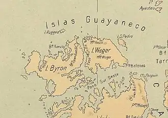 Wager Island is located in the Guayaneco Archipelago, 1,600 kilometres (990 miles) south of Santiago, in the southern part of the Gulf of Penas of the southern Pacific Ocean. It is 18 kilometres (11 miles) long on its NW-SE axis and 10 kilometres (6.2 miles) wide. Of the two main islands that make up the Guayaneco Archipelago, Byron Island is the larger, and Wager Island is the smaller. It is separated from Byron Island by Paso Rundle,[34] and separated from Islote San Pedro by Bahía Acosta.[35] Wager Island and Islote San Pedro form the northwestern terminus of the Messier Channel, while the Larenas Peninsula forms the northeastern terminus.[36] There is a lighthouse (NGA 2044) on Islote San Pedro. The Messier Channel is regularly traversed by large cargo ships and cruiseferries.[37][38]