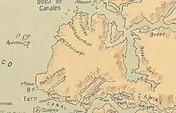 European explorers began to map this area after the discovery of the Strait of Magellan in 1520. Members of the 1553 naval expedition of Francisco de Ulloa were the first Europeans to encounter the Chono people.[4] The islands were first reached by Jesuits based in Chiloé in 1613.[5] False rumors of European settlements near the Straits of Magellan prompted the Spanish to send an expedition led by Bartolomé Gallardo in 1674–1675, and later the Antonio de Vea expedition of 1675–1676.[6][7]
