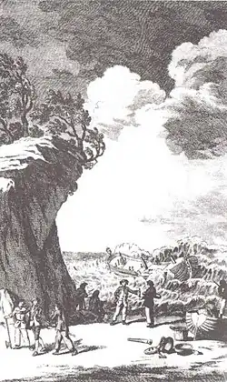 A second group of men (11 castaways and one Indian guide) departed Wager Island on 6 March 1742.[22] Guided by the Chono cheftain Martín Olleta,[23] the group navigated through Presidente Ríos Lake in the interior of Taitao Peninsula instead of rounding to the west of the treacherous Tres Montes Peninsula.[24][25] Of this group, three survivors (Captain David Cheap, midshipman John Byron, and midshipman Alexander Campbell) arrived in Chiloé Island, Chile,[26][27] in early June 1742.[28] One final survivor (Marine Lieutenant Thomas Hamilton) was rescued and brought to Chiloé Island by a Spanish search party about three months later.[26] Altogether, only 36 men returned alive to Britain, according to The Wager Disaster (2015) by Rear Admiral C. H. Layman.[29][15]