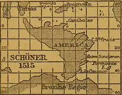 Schöner's 1515 map of America re-drawn on an equirectangular projection and on the same uniform scale as that of Waldseemüller of 1507, so as to be readily comparable.[7]