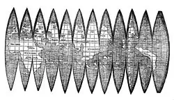 The map is drafted on a modification of Ptolemy's second projection, expanded to accommodate the Americas and the high latitudes.[3] A single copy of the map survives, presently housed at the Library of Congress in Washington, D.C.