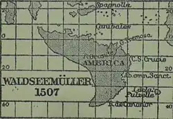 The Waldseemüller map or Universalis Cosmographia ("Universal Cosmography") is a printed wall map of the world by the German cartographer Martin Waldseemüller, originally published in April 1507. It is known as the first map to use the name "America". The name America is placed on South America on the main map. As explained in Cosmographiae Introductio, the name was bestowed in honor of the Italian Amerigo Vespucci. The map also first showed the Pacific Ocean, separating the Americas from Asia.[2]