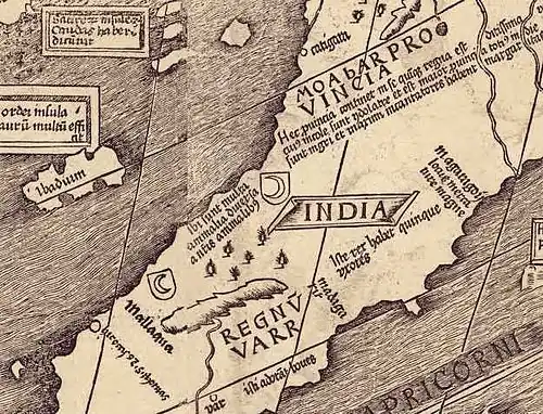 Detail of the map showing the names "Catigara" and "Mallaqua" where "was slain St. Thomas".