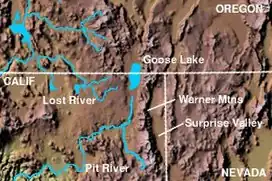 The eastern escarpment of the range overlooks the Surprise Valley in California and Warner Valley in Oregon, enclosed basins that contain Upper Alkali Lake, Middle Alkali Lake, and Lower Alkali Lake along the California–Nevada border, and the Warner Lakes (Crump and Hart lakes) in Oregon. The western side of the range overlooks a ranching and farming region drained by the forks of the Pit River, a tributary of the Sacramento River. Goose Lake is a 28-mile (45 km) long closed-basin lake located in the Goose Lake Valley along the west side of the range, straddling the California–Oregon border.[2] Goose Lake drained into the Pit River only twice in recorded history: in 1868 and 1881. The lake dried up in 1926 and from 1929 to 1934.