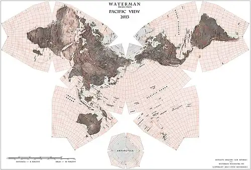 The Waterman "Butterfly" World Map is a map projection created by Steve Waterman. Waterman first published a map in this arrangement in 1996. The arrangement is an unfolding of a polyhedral globe with the shape of a truncated octahedron, evoking the butterfly map principle first developed by Bernard J.S. Cahill (1866–1944) in 1909. Cahill and Waterman maps can be shown in various profiles, typically linked at the north Pacific or north Atlantic oceans.