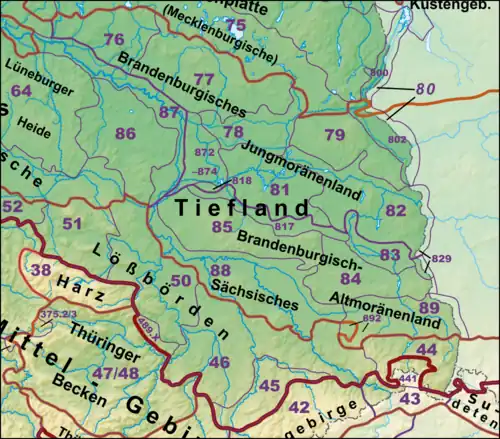 - ↑ Emil Meynen and Josef Schmithüsen: Handbuch der naturräumlichen Gliederung Deutschlands, Bundesanstalt für Landeskunde, 8th edition, Bad Godesberg, 1961 (a total of 9 issues in 8 books, updated 1960, 1:1,000,000 scale, map of major landscape units)