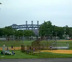 Lincoln Park is one of the largest county parks in Hudson County[8] and includes recreational facilities (tennis, track, athletic fields, golf range, biking, running) and picnicking areas. Overpasses provide pedestrian access over Truck 1-9 from the older, more urban eastern section of the park to the more natural west section on the Hackensack River. The streets ascending from the park contain an eclectic mix of architectural styles including Victorian and Edwardian mansions, and pre-war and Art Deco apartment buildings in the Bergen Section. St Aloyius Church is a prominent landmark near the park.[9]