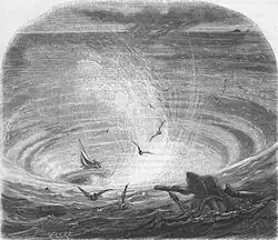 The fictional depictions of the Moskstraumen by Edgar Allan Poe, Jules Verne, and Cixin Liu describe it as a gigantic circular vortex that reaches the bottom of the ocean, when in fact it is a set of currents and crosscurrents with a rate of 18 km/h (11 mph).[10] Poe described this phenomenon in his short story "A Descent into the Maelström", which in 1841 was the first to use the word maelstrom in the English language;[9] in this story related to the Lofoten Maelstrom, two fishermen are swallowed by the maelstrom while one survives.[11]