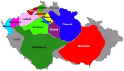 The extensive toponomastic studies, and their critical review by Henryk Łowmiański, show existence of several toponyms of settlements in Poland and Czech Republic whose origin presumably could be related to the Croatian toponym in pre-modern historical period. These are in Poland: Klwaty (Krwathi, Chrwathi Phirleonis), Klwatka Szlachecka (Krhwathi Powałya, Chrwathi), Klwatka Królewska (Krwathka, Chrwatka) around the city of Radom, Chirwatowa Wola today's Chyrowa near Wisłoka river, and Horwaty part of Czarna between San and Dniester river. In Czech Republic: two Charvátce near Ohře river, Charvátec near city of Dobrovice on river Elbe, Charvâty and Charváty near Morava river. In Czech Republic only the toponyms in Moravia have the archaic tribal names, while in Bohemia are derivations, implying were formed on the periphery or outside of the Croatian territory, and all of them only since the 9-10th century when was the expansion of Great Moravia and Duchy of Bohemia. Based on the toponyms (and historical sources), the homeland of Croatian tribes would have been in today's Southeastern Poland and Western Ukraine.[101] In literature are mentioned also other Eastern European toponyms but with doubtful etymological relation with Croatian ethnonym, for example those with root "Charb-" (Charbce, Charbicze, Charbin, Charbowo), "Karw-" (Karwacz, Karwatyno/Charwatynia, Karovath),[102] "Choro-" (Chorovjatinskaja/Chorowiacka, Chorow, Chorowa gora, Chorowica, Chorowiec etc.), "Horo-" (Horovatka, Horowe, Horowiszcze, Horowo) among others.[103]