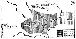 Ukrainian and Russian scholars have tended to attribute the Croats with large and influential territories in the East, meanwhile Polish and Czech scholars tended to diminish the existence of the Croats in their countries.[51] Polish scholars avoided to locate the Croats near Kraków and considered that did not border at Ruthenia because when Vladimir the Great attacked the Croats in 992 it would have been perceived as a call for war by Bolesław I the Brave.[52] However, whether the Cherven Cities were inhabited by the Lendians or White Croats, and were independent from both Poland and Kievan Rus', it is part of a wider ethnographic dispute between Polish and Ukrainian-Russian historians.[53] Regardless of that, White Croatia was initially thought to have been located along the Upper Elbe river in Northeastern Bohemia and/or around the Upper Vistula valley in Lesser Poland.[54][55][56] This is based only on the DAI description that they lived North-East of Bavaria, North of Hungary, and South of the White Serbs.[57] It is also related to the trends in argumentation among Polish and Czech historians, as the former negated the existence of Croats in Poland and latter lack of doubt they existed near Sudetes in Czech Republic.[58] However, due to information from other sources, in the 19th century became common conclusion that the Croats lived North and East of Carpathians, specifically Prykarpattia and Eastern Galicia.[59]