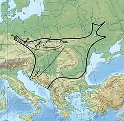 In the second-half of 20th and early 21st century, Dušan Třeštík and Gerard Labuda identified White Croatia with the multi-tribal realm of Boleslaus I, Duke of Bohemia, while Třeštík and Jaroslav Bakala more precisely located them to present-day Silesia and North Bohemia (Podkrkonoší region).[67] Richard Ekblom also placed them in Upper Silesia, and the area of Kraków, Poland.[68] Tadeusz Lehr-Spławiński mostly agreed with Niederle's location around Vistula river.[64] Francis Dvornik placed White Croatia in Galicia, western part of it was in Western Galicia with Kraków in Poland up to Northeastern Bohemian domain of the Slavnik dynasty while eastern part in Eastern Galicia (Upper Dniester).[69] Łowmiański besides Prykarpattia and Zakarpattia, placed the main part of the Croats to the Upper Vistula valley in Lesser Poland, and that the accounts in DAI identified White Croatia with Duchy of Bohemia of Boleslaus I which at the time incorporated the territory of the Vistulans and Lendians, because they were attacked by the Pechenegs, and that according to the sources it is uncertain whether the White Croats lived around the Elbe river and placing them instead in Sudetes.[70][71] He also emphasized that their localization in Silesia is theoretical construction without basis in the sources.[46] Ivo Goldstein located White Croatia around Kraków.[72] According to Noel Malcolm White Croatia was in the area of today's southern Poland.[73] Krzysztof Fokt placed them in Upper Silesia in the 9th-10th century.[74] Petr Charvát located them in Northern and Eastern Bohemia, noting that the Croat diaspora settlement follows the Carpathian range from Southeastern Poland to the Giant Mountains in Bohemia.[75] T. Živković located White Croatia in Bohemia and Southern Poland as well, but also noted anachronistic parallels with the 9-10th century Duchy of Bohemia.[76] A. Majorov distinguishes between the terms and concepts of "Great Croatia" and "White Croatia". He agrees that White Croatia and those Croats identified as "White" were a second concept appeared to have some historical presence in the Upper Elbe and Upper Vistula regions, but that Great Croatia, the motherland of the Croats, was primary concept located in Eastern Prykarpattia and Tisza river basin in Zakarpattia. Majorov suggests that the author of the DAI made an attempt to reconcile the contradictions among various conflicting sources.[77][78] Sedov believed that the Croats arose among the Antes of Penkovka culture. After that, they migrated West and settled in several groups in various places.[61] In 1982, argued that one of these groups were Southwestern neighbours of the Dulebes, living in the Northern and Southern area of Eastern Prykarpattia.[59] Ukrainian and Russian historians and archaeologists generally argued that Great Croatia, also in the sense of homeland from where Carpathian Croats emigrated to the Balkans,[79][80] included almost all the lands of later historical region of Galicia.[59][81]