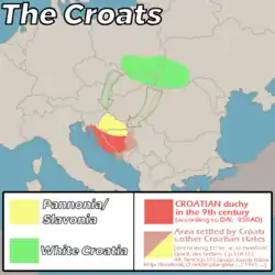 In 21st-century scholarship, historians do not agree on the location or even the existence of Great Croatia and White Croatia.[17] Scholars do believe that the Croats gradually moved from the East to the West and South.[18][19] According to Majorov, in the 10th century, the ethnic Croats are believed to have been surviving in remnant communities, scattered in the East in Ukraine, Poland and Slovakia, with others in the West in Bohemia.[20] Given the tradition of using colours for cardinal directions, Leontii Voitovych argued that the Great Croatia referred to in the 6-7th century no longer existed in the 10th century. The term White Croatia was used to refer to the Western part of its territory.[21] Some scholars such as F. Rački, M. Kos, L. Niederle and Nada Klaić believed in its existence, others such as V. Jagić, J. B. Bury, K. Jireček and A. Brückner have rejected the existence of an independent polity, while F. Westberg, J. Markwart, L. Hauptmann, H. Łowmiański believed in its existence in the sense Constantine VII was referring to the Duchy of Bohemia which in the 10th century controlled Southern Poland and Western Ukraine.[22][19][23] Similarly, V. V. Sedov noted that there is no archaeological material to prove its existence.[18][19] However, recent archaeological research of 7-10th century sites in Western Ukraine suggests otherwise,[24] that Great Croatia most probably was a polycentric proto-state.[25][26]