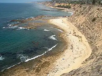 The beach is quite rocky, and the cove contains a rocky underwater reef that hosts a kelp forest. The kelp forest provides habitat for fauna such as California sheephead fish, chestnut cowries, garibaldi, giant keyhole limpets, moray eels, nudibranchs, painted greenling fish, rock scallops, sea cucumbers, sea stars, sea fans, and sheep crabs.[4][5]