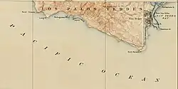 Racist California state laws prevented Japanese land ownership but the sulphur springs apparently earned the White Point resort a partial "sanatorium" exception.[18] In 1917, Tamiji Tagami and Tojuro Tagami, with backing from investors, leased the property from Sepulveda and constructed a "hotel, a ballroom, a bathhouse, two restaurants, a children's swimming pool, bird and monkey cages, and a few slot machines and card tables."[3] A small pumping plant was constructed and water from the natural hydrothermal features was piped into sulphur-water soaking pools.[17][3] Shuttles brought visitors from Point Fermin and Los Angeles, and an automobile road was carved out of the cliffs around 1923,[18] and improved in 1926.[19] White Point resort was sometimes marketed as Radium Springs, which was part of a widespread early-20th-century radium fad (now known to be a form of radioactive quackery).[20] A 1923 Los Angeles Times profile of the resort described Sunday morning as church (at either Buddhist or Christian services) and Sunday evening as a party night: "Somewhere about our wicked city they have learned to undulate to jazz music and an American orchestra from San Pedro is always on hand Sunday evenings to play for one steps and fox trots!"[18] There was a restaurant, with American and American Chinese food served on the ground floor, and Japanese food served on the second ("The upper room caters strictly to Japanese.")[18]