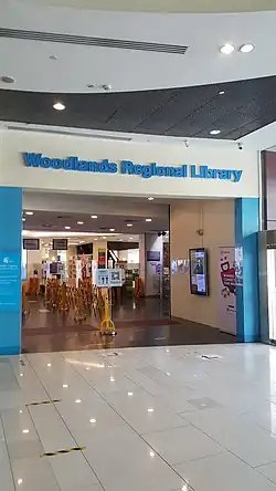 Woodlands Regional Library, the largest neighbourhood library in Singapore at the time of its launch, is operated by the National Library Board. The four-storey public library within the Woodlands Civic Centre caters to all ages and is organised according to themes of general, reference, teens, and children.