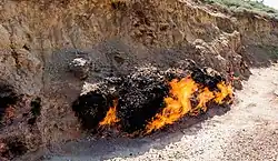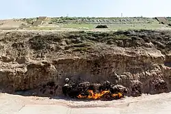 Yanar Dagh (Azerbaijani: Yanar Dağ, lit. 'burning mountain') is a natural gas fire that burns perpetually on a hillside on the Absheron Peninsula near Baku, the capital of Azerbaijan, a country known as "the Land of Fire". Flames rise up to 3 metres (9.8 ft) from a thin, porous layer of sandstone.[1][2]