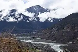 The Yarlung Tsangpo Grand Canyon, also known as the Yarlung Zangbo Grand Canyon, the Tsangpo Canyon, the Brahmaputra Canyon or the Tsangpo Gorge (simplified Chinese: 雅鲁藏布大峡谷; traditional Chinese: 雅魯藏布大峽谷; pinyin: Yǎlǔzàngbù Dàxiágǔ), is a canyon along the Yarlung Tsangpo River in Tibet Autonomous Region, China. It is the deepest canyon in the world,[1][a] and at 504.6 kilometres (313.5 mi) is slightly longer than the Grand Canyon in the United States, making it one of the world's largest.[1][3] The Yarlung Tsangpo (Tibetan name for the upper course of the Brahmaputra) originates near Mount Kailash and runs east for about 1,700 kilometres (1,100 mi), draining a northern section of the Himalayas before it enters the gorge just downstream of Pei, Tibet, near the settlement of Zhibe. The canyon has a length of about 240 kilometres (150 mi) as the gorge bends around Mount Namcha Barwa (7,782 metres or 25,531 feet) and cuts its way through the eastern Himalayas. Its waters drop from about 2,900 metres (9,500 ft) near Pei to about 1,500 metres (4,900 ft) at the end of the Upper Gorge where the Po Tsangpo River enters. The river continues through the Lower Gorge to the Indian border at an elevation of 660 metres (2,170 ft). The river then enters Arunachal Pradesh and eventually becomes the Brahmaputra.[4][5]