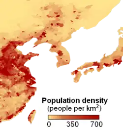 The coasts of the Yellow Sea are very densely populated, at approximately 250 inhabitants per square kilometer (650/sq mi).[36] The sea waters had been used for fishing by the Chinese, Korean and Japanese ships for centuries. The bottom layers are especially rich in fish with about 200 fish species exploited commercially, especially sea bream, croakers, lizard fishes, prawns, cutlassfish, horse mackerel, squid, eel, filefish, Pacific herring, chub mackerel, flounder[37] and jellyfish.[38] The intensity of fishing has been gradually increasing for China and Korea and decreasing for Japan. For example, the production volumes for China rose from 619,000 tonnes in 1985 to 1,984,400 tonnes in 1996.[39] All species are overfished, however, and while the total catchments are rising, the fish population is continuously declining for most species.[4][40]