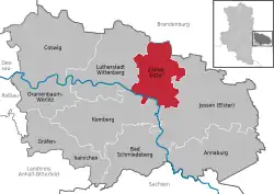 Zahna-Elster is a town in the district of Wittenberg, in Saxony-Anhalt, Germany. It was formed on 1 January 2011 by the merger of the former municipalities Zahna, Dietrichsdorf, Elster (Elbe), Gadegast, Leetza, Listerfehrda, Mühlanger, Zemnick and Zörnigall. On 29 May 2013 the incorporation of Mühlanger was reverted as a result of a decision of the Constitutional court of Saxony-Anhalt,[3] but it was incorporated again on 1 January 2014. These former municipalities are now the 9 Ortschaften (municipal divisions) of the town Zahna-Elster.[4]