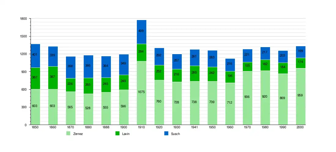 Zernez has a population (as of December 2020) of 1,506.[9] As of 2013, 18.6% of the population are resident foreign nationals. Over the last 3 years (2010-2013) the population has changed at a rate of 1.14%. The birth rate in the municipality, in 2013, was 8.7 while the death rate was 6.9 per thousand residents.[6]