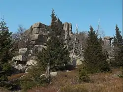 The Zeterklippen are a striking rock formation or tor on the 930-metre-high Renneckenberg mountain, overlooking the Ilse valley in the Harz mountains in Germany. The Renneckenberg is an eastern sub-peak of the Brocken. The rocks themselves lie at a height of about 830 metres (2,720 ft) above sea level. They can be reached from the Molkenhausstern after about 2.5 km. The track initially runs uphill through dense spruce forest until the view opens out towards the Hohnekamm and down to Wernigerode. Then the route branches off to the right onto a steep, 0.5 km, path and, after about 200 m, a gentler 0.4 km path leads to the Große Zeterklippe ("Great Zeter Rock"). Immediately below this highest of the rocks is a mountain hut that dates to the time when a botanical garden had been laid out here as a replacement for the inaccessible Brockengarten.