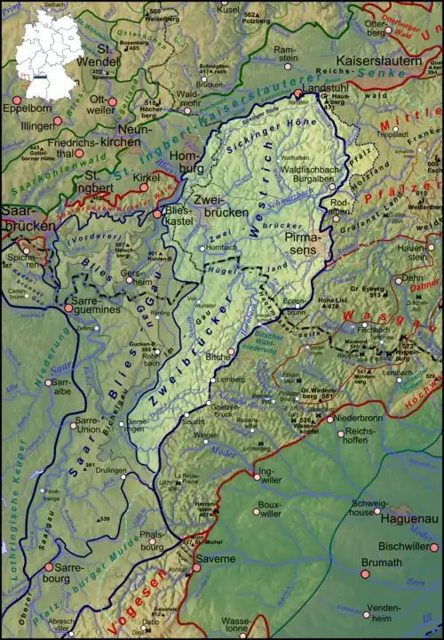 The central section of the plateau's western boundary with the Saint Ingbert-Kirkeler Woods and, further south, with the Bliesgau, runs (according to the Bundesanstalt für Landeskunde, Saarbrücken sheet, and popular opinion) just west of the state border with Saarland and does not cross the valley of the Blies, which from here on forms the boundary with the first-named of the two regions. This compares with a purely Saarland division according to Quasten which also counts a narrow strip of land southwest of Blieskastel (right = west of the Blies) as part of the Zweibrücken Westrich.[9]