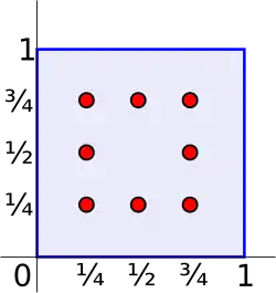 For example, suppose X is the set of points in the two-dimensional plane, R is the set of closed filled rectangles (products of closed intervals), and P is the unit square [0, 1] × [0, 1]. Then the set N consisting of the 8 points shown in the adjacent diagram is a 1/4-net of P, because any closed filled rectangle intersecting at least 1/4 of the unit square must intersect one of these points. In fact, any (axis-parallel) square, regardless of size, will have a similar 8-point 1/4-net.