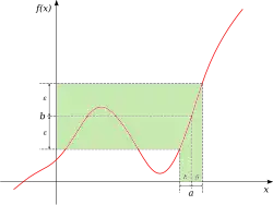 if the following property holds: for every real ε > 0, there exists a real δ > 0 such that for all real x, |x − p| < δ implies |f(x) − L| < ε.[8] Symbolically,