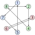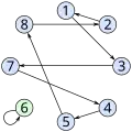 and consists of a cycle of length 7 and a cycle of length 1. The cycle notation is not unique since a cycle of length can be written in different ways depending on the starting number of the cycle. During the opening of the drawers using the above strategy, each prisoner follows a single cycle which always ends with their own number. In the case of eight prisoners, this cycle-following strategy is successful if and only if the length of the longest cycle of the permutation is at most 4. If a permutation contains a cycle of length 5 or more, all prisoners whose numbers lie in such a cycle do not reach their own number after four steps.