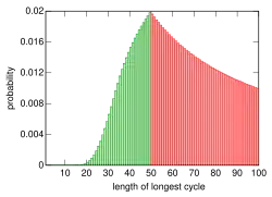 In the initial problem, the 100 prisoners are successful if the longest cycle of the permutation has a length of at most 50. Their survival probability is therefore equal to the probability that a random permutation of the numbers 1 to 100 contains no cycle of length greater than 50. This probability is determined in the following.