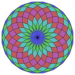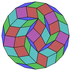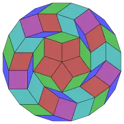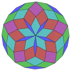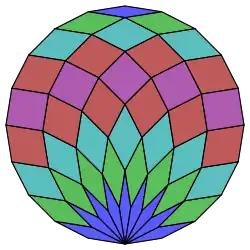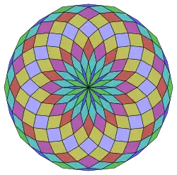 Coxeter states that every zonogon (a 2m-gon whose opposite sides are parallel and of equal length) can be dissected into m(m-1)/2 parallelograms.[4] In particular this is true for regular polygons with evenly many sides, in which case the parallelograms are all rhombi. For the icosagon, m=10, and it can be divided into 45: 5 squares and 4 sets of 10 rhombs. This decomposition is based on a Petrie polygon projection of a 10-cube, with 45 of 11520 faces. The list OEIS: A006245 enumerates the number of solutions as 18,410,581,880, including up to 20-fold rotations and chiral forms in reflection.