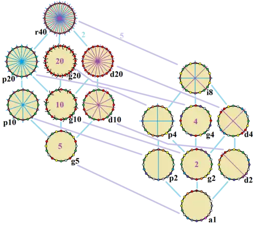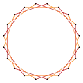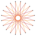 These 10 symmetries can be seen in 16 distinct symmetries on the icosagon, a larger number because the lines of reflections can either pass through vertices or edges. John Conway labels these by a letter and group order.[3] Full symmetry of the regular form is r40 and no symmetry is labeled a1. The dihedral symmetries are divided depending on whether they pass through vertices (d for diagonal) or edges (p for perpendiculars), and i when reflection lines path through both edges and vertices. Cyclic symmetries in the middle column are labeled as g for their central gyration orders.