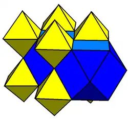 A cell-first cross-section uses some hyperplane parallel to one of the octahedral cells of a 24-cell. Consider, for instance, some hyperplane orthogonal to the vector (1,1,0,0). The cross-section of {3,4,3,3} by this hyperplane is a rectified cubic honeycomb. Each cuboctahedron in this honeycomb is a maximal cross-section of a 24-cell whose center lies in the plane. Meanwhile, each octahedron is a boundary cell of a (4-dimensional) 24-cell whose center lies off the plane. Shifting this hyperplane till it lies halfway between the center of a 24-cell and the boundary, one obtains a bitruncated cubic honeycomb. The cuboctahedra have shrunk, and the octahedra have grown until they are both truncated octahedra. Shifting again, so the hyperplane intersects the boundary of the central 24-cell gives a rectified cubic honeycomb again, the cuboctahedra and octahedra having swapped positions. As the hyperplane sweeps through 4-space, the cross-section morphs between these two honeycombs periodically.