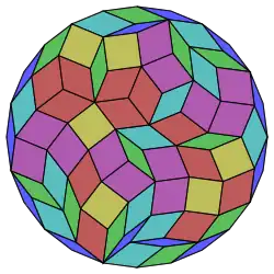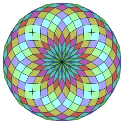 Coxeter states that every zonogon (a 2m-gon whose opposite sides are parallel and of equal length) can be dissected into m(m-1)/2 parallelograms.[3] In particular this is true for regular polygons with evenly many sides, in which case the parallelograms are all rhombi. For the regular icositetragon, m=12, and it can be divided into 66: 6 squares and 5 sets of 12 rhombs. This decomposition is based on a Petrie polygon projection of a 12-cube.