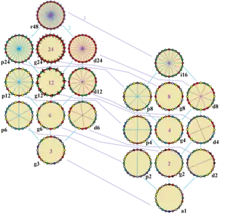 The regular icositetragon has Dih24 symmetry, order 48. There are 7 subgroup dihedral symmetries: (Dih12, Dih6, Dih3), and (Dih8, Dih4, Dih2 Dih1), and 8 cyclic group symmetries: (Z24, Z12, Z6, Z3), and (Z8, Z4, Z2, Z1).