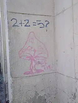 In the late 19th century, the Russian press used the phrase 2 + 2 = 5 to describe the moral confusion of social decline at the turn of a century, because political violence characterised much of the ideological conflict among proponents of humanist democracy and defenders of tsarist autocracy in Russia.[11] In The Reaction in Germany (1842), Mikhail Bakunin said that the political compromises of the French Positivists, at the start of the July Revolution (1830), confirmed their middle-of-the-road mediocrity: "The Left says, 2 times 2 are 4; the Right, 2 times 2 are 6; and the Juste-milieu says, 2 times 2 are 5".[12][13][14]