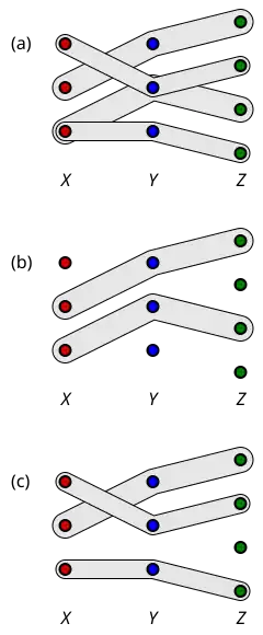 This decision problem is known to be NP-complete; it is one of Karp's 21 NP-complete problems.[1] It is NP-complete even in the special case that k = |X| = |Y| = |Z| and when each element is contained in at most 3 sets, i.e., when we want a perfect matching in a 3-regular hypergraph.[1][2][3] In this case, a 3-dimensional matching is not only a set packing, but also an exact cover: the set M covers each element of X, Y, and Z exactly once.[4] The proof is by reduction from 3SAT. Given a 3SAT instance, we construct a 3DM instance as follows:[2][5]