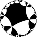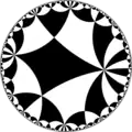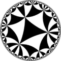 The dual of the tiling represents the fundamental domains of (*664) orbifold symmetry. From [(6,6,4)] (*664) symmetry, there are 15 small index subgroup (11 unique) by mirror removal and alternation operators. Mirrors can be removed if its branch orders are all even, and cuts neighboring branch orders in half. Removing two mirrors leaves a half-order gyration point where the removed mirrors met. In these images fundamental domains are alternately colored black and white, and mirrors exist on the boundaries between colors. The symmetry can be doubled to 862 symmetry by adding a bisecting mirror across the fundamental domains. The subgroup index-8 group, [(1+,6,1+,6,1+,4)] (332332) is the commutator subgroup of [(6,6,4)].